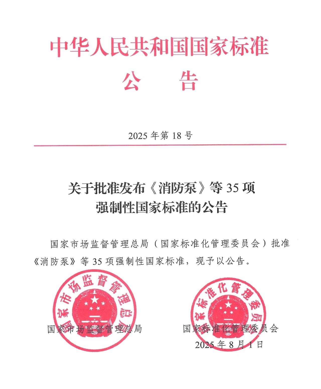 2025年8月1日,国家市场监督管理总局、国家标准化管理委员会联合发布《关于批准发布<消防泵>等35项强制性国家标准的公告》(2025年第18号),标志着我国消防装备技术规范体系迎来重大升级。其中,由上海东方泵业(集团)有限公司深度参与修订的GB 6245-2025《消防泵》国家标准正式亮相,并将于2026年8月1日起在全国范围内强制实施。